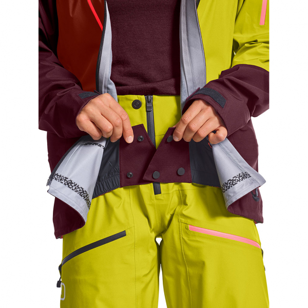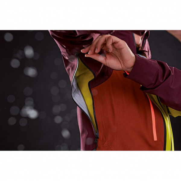 Die wind- und wasserdichte Hochleistungsmembran Dermizax EV von Toray ist an besonders kälteempfindlichen Körperstellen mit feiner Merinowolle unterlegt, die optimalen Wärmerückhalt und bequemen Sitz garantiert. Bei stürmischen Verhältnissen bieten die 2-fach regulierbare Sturm-Kapuze sowie weitenregulierbare Saum- und Ärmelabschlüsse zusätzlichen Schutz. Wenn es hingegen anstrengend wird, sorgen ergonomische Unterarm-Belüftungsreißverschlüsse für zusätzliche Ventilation.